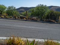 the view across a deserted road at a mountain with cactuss and rocks in it