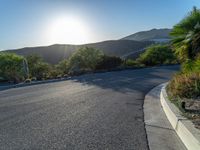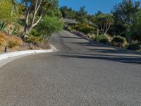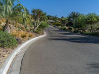 a paved driveway in an area with a road lined with trees and cactuses on either side of the road