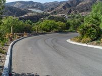 a very long winding road that goes up a mountain top into the desert area with some plants
