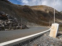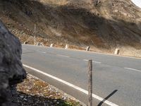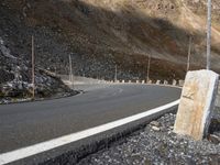 A straight tar road winds down the sloping terrain of the Austrian highlands, with vegetation, wood, and street lights lining the foreground. The clear sky, yellow bedrocks, and mountain landforms make up the beautiful landscape of this European country.