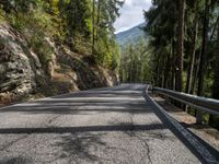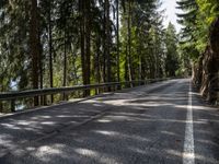 A winding road in Austria, Europe, stretches out towards a picturesque landscape of forests and nature, seen from a 1/4 angle point of view on an asphalt road.