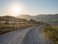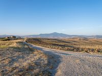 A rugged dirt road leading straight down the road through a rural landscape of Tuscany, Italy, at dawn as the sun rises over the harvest in the garden and the clear sky is kissed with sunshine.