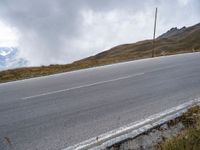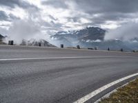a paved road with mountains behind it under a cloudy sky and clouds above it at the top of a mountain range