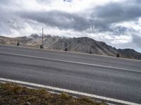 an empty asphalt street with mountains in the distance and a cloudy sky overhead it all