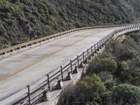 A view of the Pacific Coast Highway winding along the Armco barrier and concrete bridge in Big Sur, California. The S-curve navigates through the coastal mountain range and highlands, creating a stunning landscape of rolling hills, rocky shorelines, and tree-lined roads against a backdrop of clear blue skies.