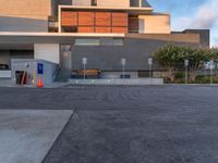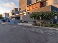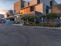 empty parking lot next to grey buildings with street signs and trees at dusk in front