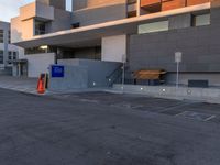 the building that houses a residence and a parking lot is built into concrete and has red caution cones