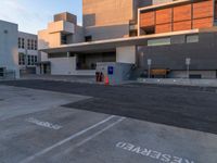 the parking lot near the front of this building is empty with no cars or vehicles