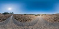 A rugged dirt road lined with trees and harvested gardens winds up a hill in the scenic landscape of Tuscany, Italy, providing a stunning coastal view. The clear blue sky and natural geology of the land lot make this a picture-perfect rural scene.