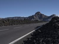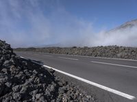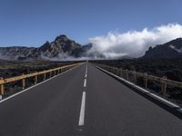 Asphalt road winding through the Spanish highlands, leading to the Tenerife volcano. The Armco barrier and mountain landforms dot the landscape, while the clear sky and open space stretch out above.