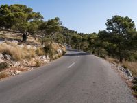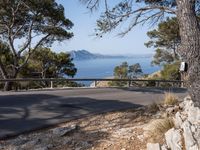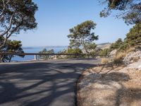 Take in the majestic views of the coastal Mallorca landscape from the winding road bordered by an Armco barrier, with a clear sky and the Mediterranean Sea in the background.