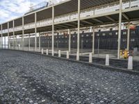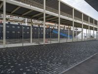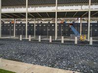 A railway track rolls along the curbs of Lisbon, Portugal, passing through a pier, a stadium, and a bridge. Metals and concrete structures contrast the vegetation and trees of the metropolitan area, while the sky is clear and tinged with shades of blue.