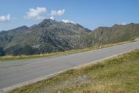 a motorcycle on a country road in front of mountains near grass and bushes, in front of a large mountain