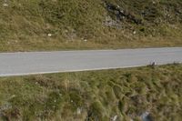 a curve road stretches into the distance on the hillside top next to a grassy hillside