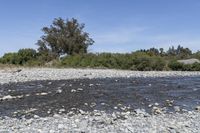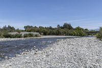 A scenic road winds through the rugged landscape of New Zealand's Wairarapa region under a clear sky, with low water levels in the river and creek. The off-road track is covered in gravel and dirt, offering an open space for outdoor activities. Contrails from passing planes leave their mark in the sky, adding a touch of modernity to the natural surroundings.