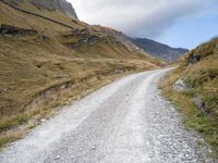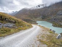 A gravel track leads the eye through the landscape of Austria, with a lake, open spaces, and rugged mountains in the backdrop, all under a gloomy grey sky.