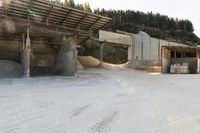 A low dirt road winds through the rugged landscape of Wairarapa, New Zealand, passing by a factory and construction site. Gravel and contrails add to the industrial feel of the area, while a loading dock and storage facilities can be seen in the distance.