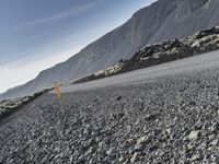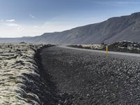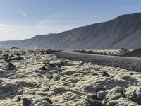 A stunning view of the volcanic landscape of Iceland, with a asphalt road winding through a rugged mountain range, dotted with grass and rock outcrops, and a clear sky stretching out to the horizon.