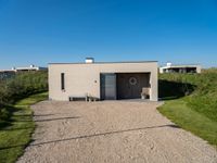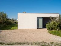 A view of a rural Dutch landscape with a modern villa, featuring a combination of concrete, grass and asphalt surfaces, a building with a facade, windows, siding, and a roof, a tree providing shade, vegetation, and a land lot with an open space.