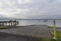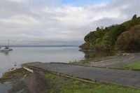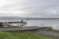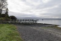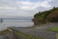 A serene rural landscape at dawn, showcasing lush vegetation, tall trees, and a wooden boat ramp leading to the calm waters. The highland terrain and grey sky in the background add to the peaceful ambiance of the scene.