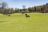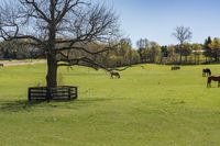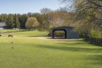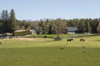 Scenic view of a lush green rural landscape in Ontario, Canada with a farmhouse and open grassy plain on a sunny day
