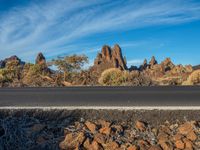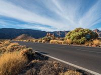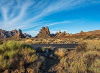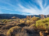 Scenic view of a rural landscape in Tenerife, Canary Islands, Spain with lush vegetation, low grassy plains, and mountain ranges in the background.