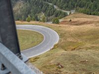 An aerial view of the winding asphalt road below with an Armco barrier in the foreground and the rural landscape of Austria in the background, featuring a guard rail, switchback curves, and open spaces full of clouds and mountains, providing an elevated overview of the beautiful nature of Europe on a sunny day.