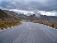 A winding road with a dramatic S-Curve lies against a backdrop of a grey cloudy sky, a mountain range, a lake, and a rural landscape with houses, vegetation, and other natural features, providing a unique mode of transport in this highland plain of Austria, Europe.
