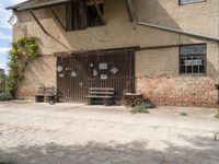 A rural road, lined with gravel and lush green nature, leads straight down the road to a barn and house in the German countryside. The clear sky and concrete street profile a peaceful day on the farm.
