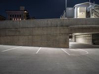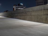 A view of a modern office building in the business district of Salt Lake City, USA, illuminated by artificial light. A concrete street, parking garage, and rooftop are visible straight down the road.