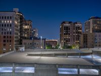 From a high position, an elevated view of the city of Salt Lake City, Utah, USA is revealed. Artificial light illuminates the modern architecture, concrete street and parking deck of the business district.