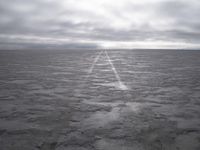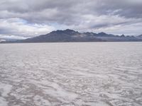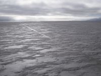 A black and white winter scene of the salt lake and lake shore in Salt Lake City, Utah. The glacial lake is surrounded by a dry, desert wilderness and the horizon reveals a highland mountain range in the distance.
