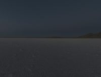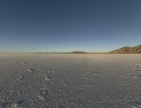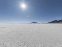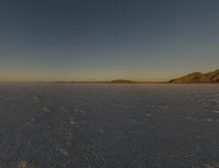 The stark and salty landscape of Utah's Bonneville Speedway is illuminated in the evening light, with the sun setting over the surrounding wadi, ice-covered lake, and mountain landforms. The two-lane road winds through the dry desert, a clear reminder of the state's natural environment and water resources.