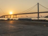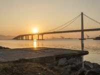 A breathtaking view of the cable-stayed San Francisco Bridge at dawn, spanning over the coastal waters, with the sun visible on the horizon.