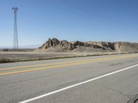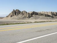 A stunning view of the California desert landscape with mountains and rock formations, as seen from a highway road trip. The clear sky and yellow lines on the asphalt road add to the beauty of the nature and geology of the area.