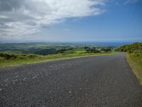 A lush green landscape with a coastal road curving through the picturesque rural scenery