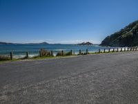A breathtaking view of a coastal landscape with an azure lake, lush vegetation, and majestic mountains in the background. The clear blue sky and puffy white clouds add to the beauty of the scene. A winding road surface made of asphalt leads to the lake, providing a perfect route for recreational activities. The dirt and gravel surface near the lake's bank is ideal for nature enthusiasts to explore and enjoy the open space. A wooden fence separates the lake from the beach, providing a safe and picturesque environment for visitors. The tar road on the horizon offers a glimpse of civilization in this serene natural setting.