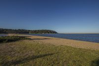 a grassy field next to the water with a small beach in the distance with no people at the end