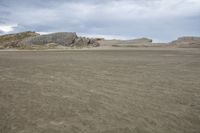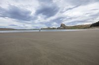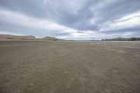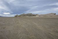 A breathtaking view of a coastal landscape with singing sand and mountain landforms, showcasing the beauty of nature and open spaces.