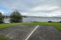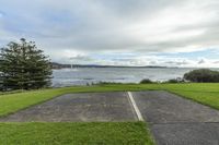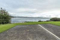 a parking spot is on the water front beach in a residential area that overlooks a bay and trees