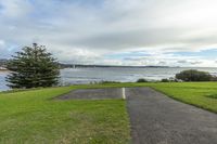 A beautiful day by the coast, showcasing the stunning coastal landscape with water, grass, and vegetation.