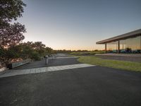 A beautiful coastal road with lush vegetation, shade from trees, and a clear sky at dawn.