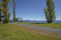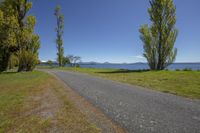A picturesque coastal road surrounded by lush vegetation and towering mountains, under a clear blue sky.