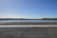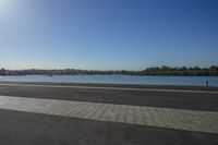 A breathtaking view of a coastal road winding through a lush landscape next to an azure lake, with clear skies and calm waters reflecting the sunlight.