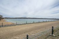 A beautiful landscape with a road surface and asphalt leading to a stunning coastal view. The horizon stretches out with clear blue skies, fluffy clouds, and lush vegetation. The road is lined with trees and a wooden fence. The straight road takes you down to the sandy beach and sparkling ocean waters.
