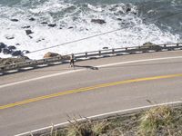 A beautiful view of the coastal road in California, USA, with the ocean on one side and lush green mountains on the other. The road surface is smooth asphalt, winding through the picturesque landscape with tall trees and grassy slopes. The elevated highway offers a top-down perspective of the Pacific Coast Highway, guarded by Armco barriers and yellow guard rails. The scenic route is perfect for a relaxing vacation, with stunning views of the sea, shore, and sandy beaches.