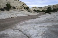 a dirt road that runs through the mountains near a stream of water and rocks on the edge