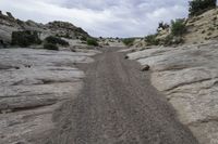 a motorcycle is driving down the desert by some boulders and boulders of various sizes, patterns and textures