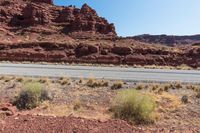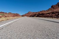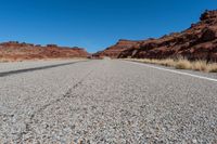A straight road cutting through the red rock canyons of Utah's Canyonlands National Park, showcasing the rugged beauty of the desert landscape.
