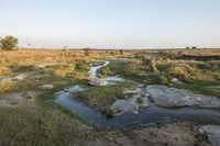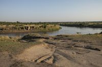 A beautiful view of a rugged road surrounded by sand, water, dirt, grass, and open space in Africa. The clear sky and natural environment make it a perfect place for recreational activities and exploring off-road tracks. The rocky terrain and water resources add to the geology of the area, with a river and coastal bog along the bank. The surface of the landscape is a mix of gravel, wetland, salt marsh, and a serene lake and reservoir. This stunning image captures the essence of Africa's diverse and breathtaking scenery.